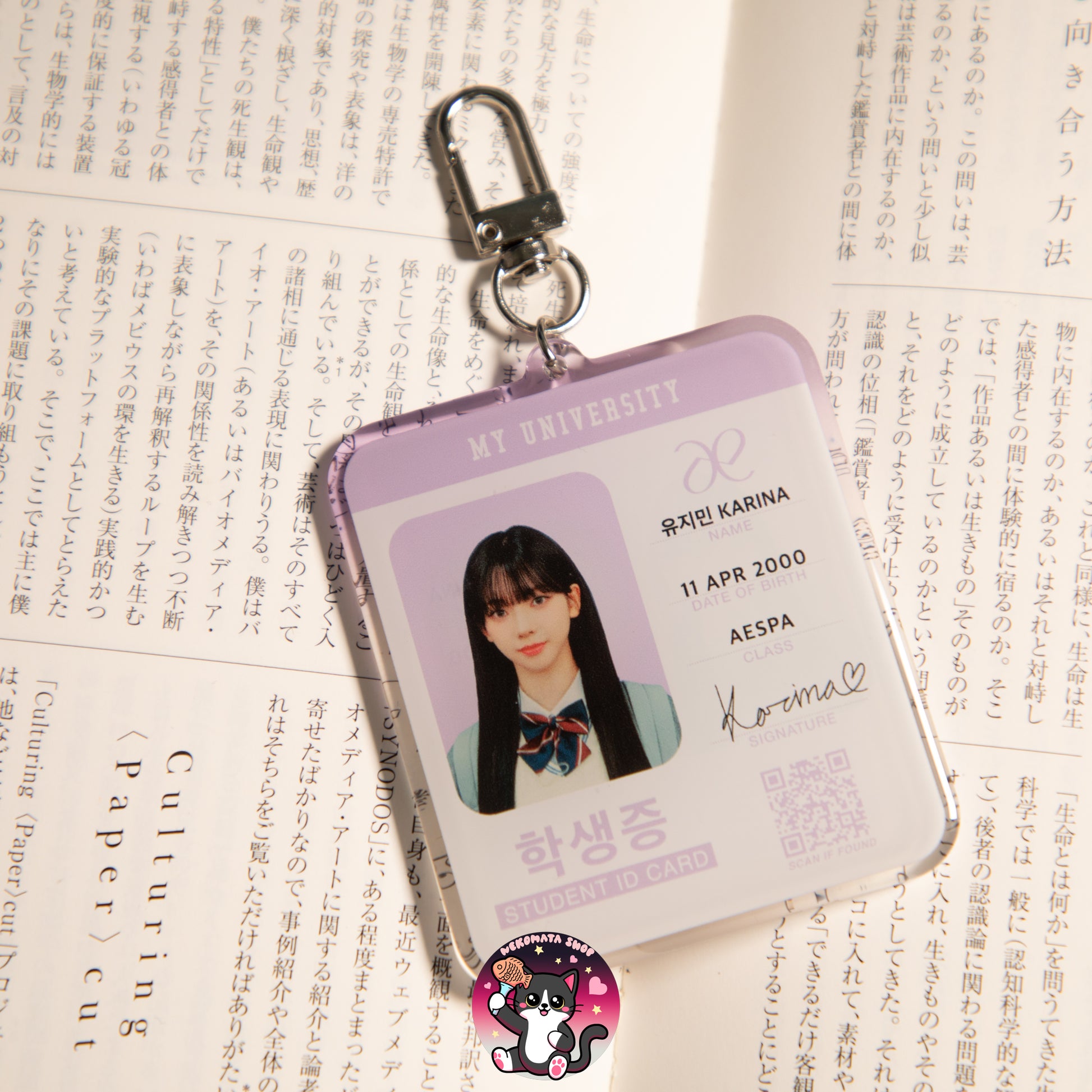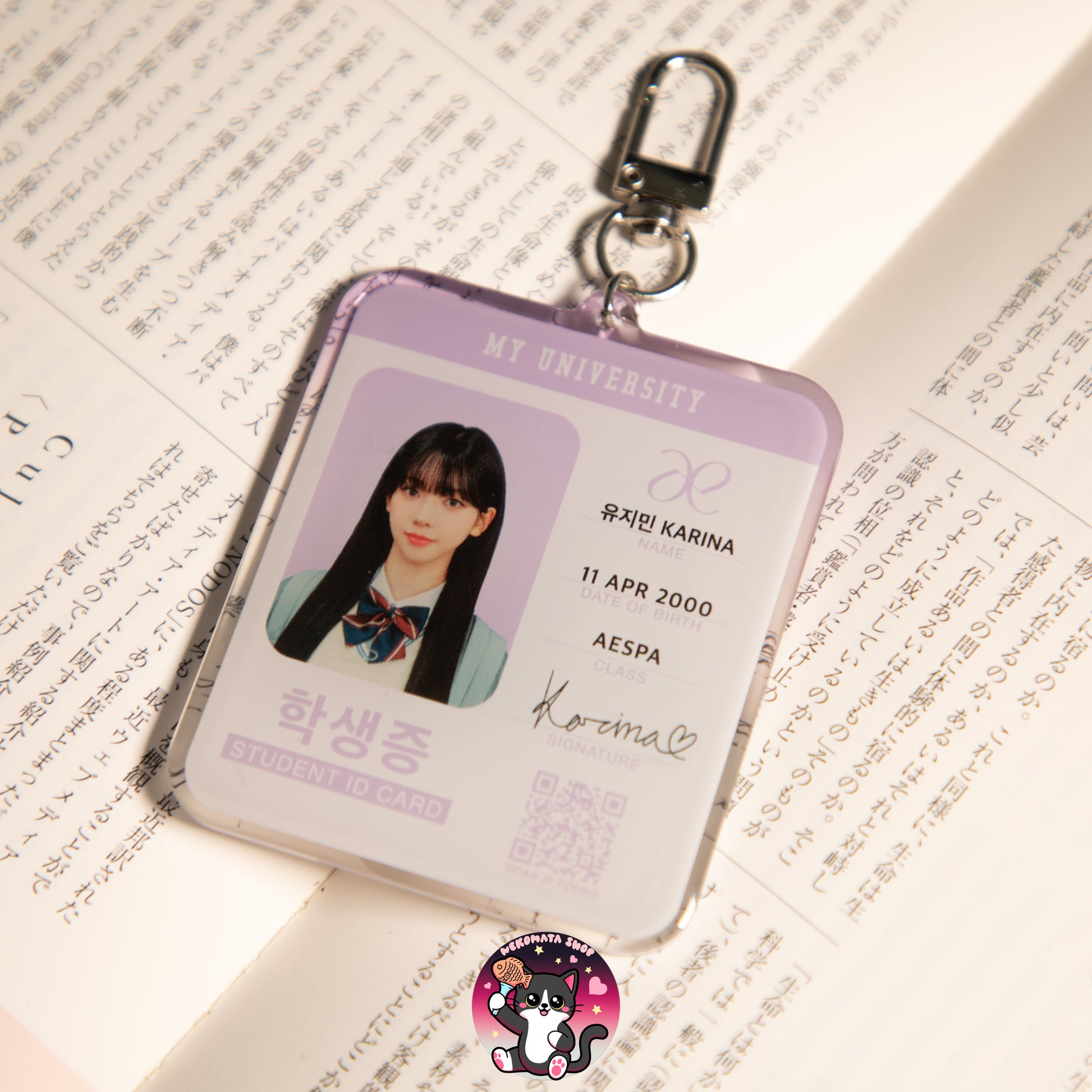 Karina lost her student ID card during a busy day at school 🎒, but now you can keep it safe as a stylish keychain 🔑! Carry a piece of her school life with you, and never worry about losing this little treasure 💖.